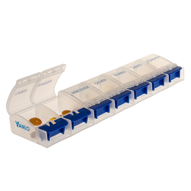 Italienisch beschriftete Wochen-Pillendose der Marke VANLO – Ideal für eine sichere Medikamentenaufbewahrung